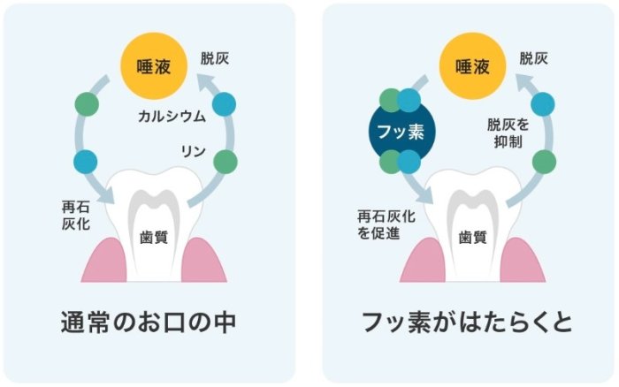 私たちの口腔内では、飲食をするたびに歯の表面(エナメル質)からカルシウムやリンが溶け出す「脱灰」と、それを唾液の成分によって元に戻す「再石灰化」が繰り返されています。フッ素はこの再石灰化を促進する働きを持ち、溶け出したミネラルを効率よく歯の表面に再沈着させることで、初期むし歯の自然修復を助けます。