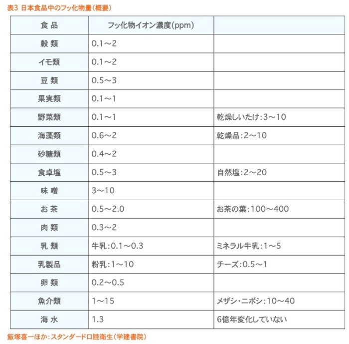 フッ化物は自然界に広く存在し、日本国内で流通しているほとんどの食品に微量ながら含まれています。 特に、食塩やお茶、魚介類のフッ化物濃度は比較的高いことが分かります。