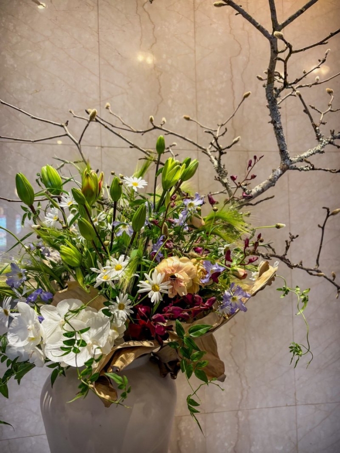 今回のお花は、あえてつぼみの多いお花を中心に生けていただいています。