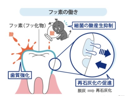 フッ素はむし歯菌の働きを弱め、菌の増殖を防ぎます。